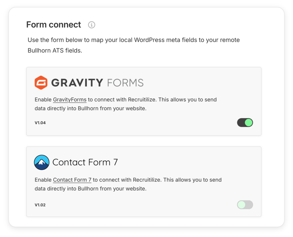Recruitilize Form Connect add-on allows you to send candidate data from your existing WordPress forms directly into Bullhorn. Using the same simple field-mapping interface, you can map form fields and input types to Bullhorn candidate records, ensuring data is captured accurately and consistently.