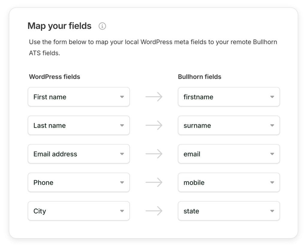 Recruitilize makes it easy to map data between Bullhorn and your WordPress website. Whether you’re working with standard fields or custom fields, you can control exactly how job and candidate data is synced and displayed.